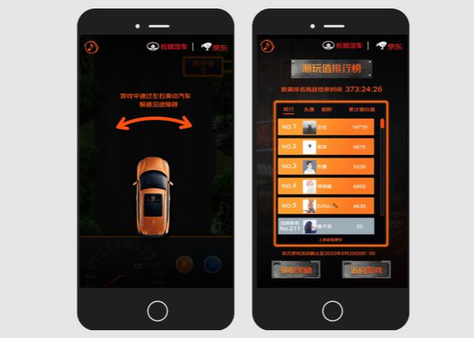 H5介绍:赛车互动小游戏,用户通过赛车游戏互动,每个人都有三次游戏的累计潮玩值,可以查看自己排行榜,参与活动奖励,领取京东优惠券。最后还可以输入自己的个人信息,预约线下试驾。